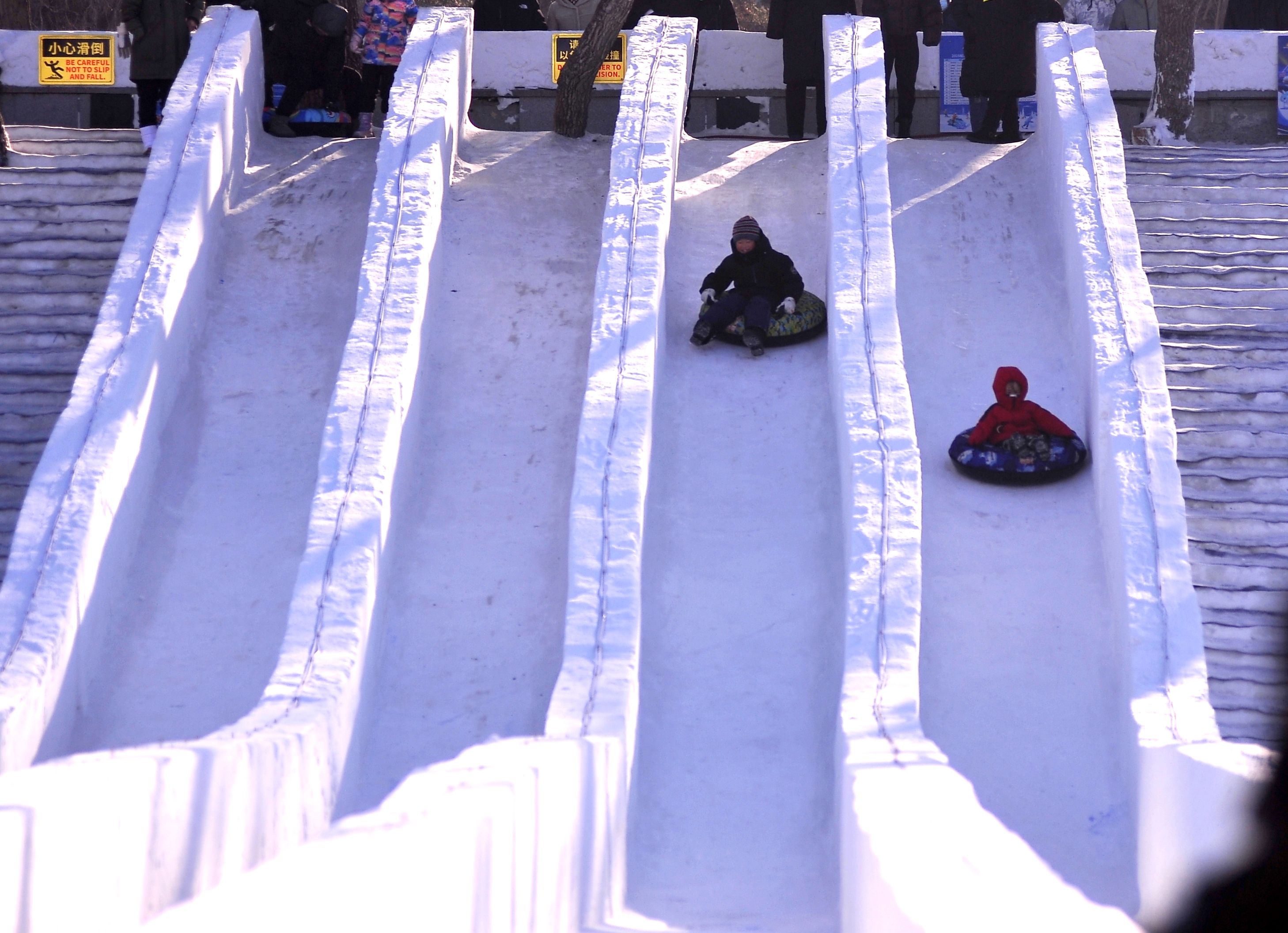 位于园区西侧的儿童雪滑梯,长20多米,有四个雪滑道。孩子们自带雪圈可以免费玩。